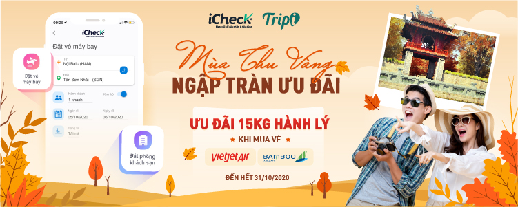 Nhằm gia tăng tiện ích cho người dùng, iCheck hợp tác TripI ra mắt tính năng đặt phòng khách sạn, mua vé máy bay ngay. Nhân dịp này, hai bên phối hợp triển khai chương trình ưu đãi đặc biệt dành cho khách hàng mua vé máy bay Vietjet & BamBoo. Theo đó, khách hàng sẽ được miễn phí gói hành lý 15kg khi mua vé Vietjet, đổi vé hoặc mua thêm dịch vụ hành lý. Chương trình áp dụng cho tất cả các chuyến bay Nội địa đặt mua trước 3 tiếng so với giờ khởi hành và khởi hành từ ngày 12.08.2020 – 24.10.2020.